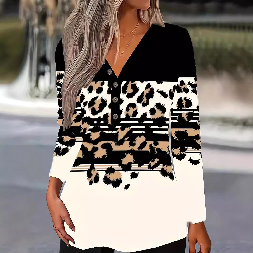 Ladies Printed V-neck T-shirt Casual Long Sleeve Top